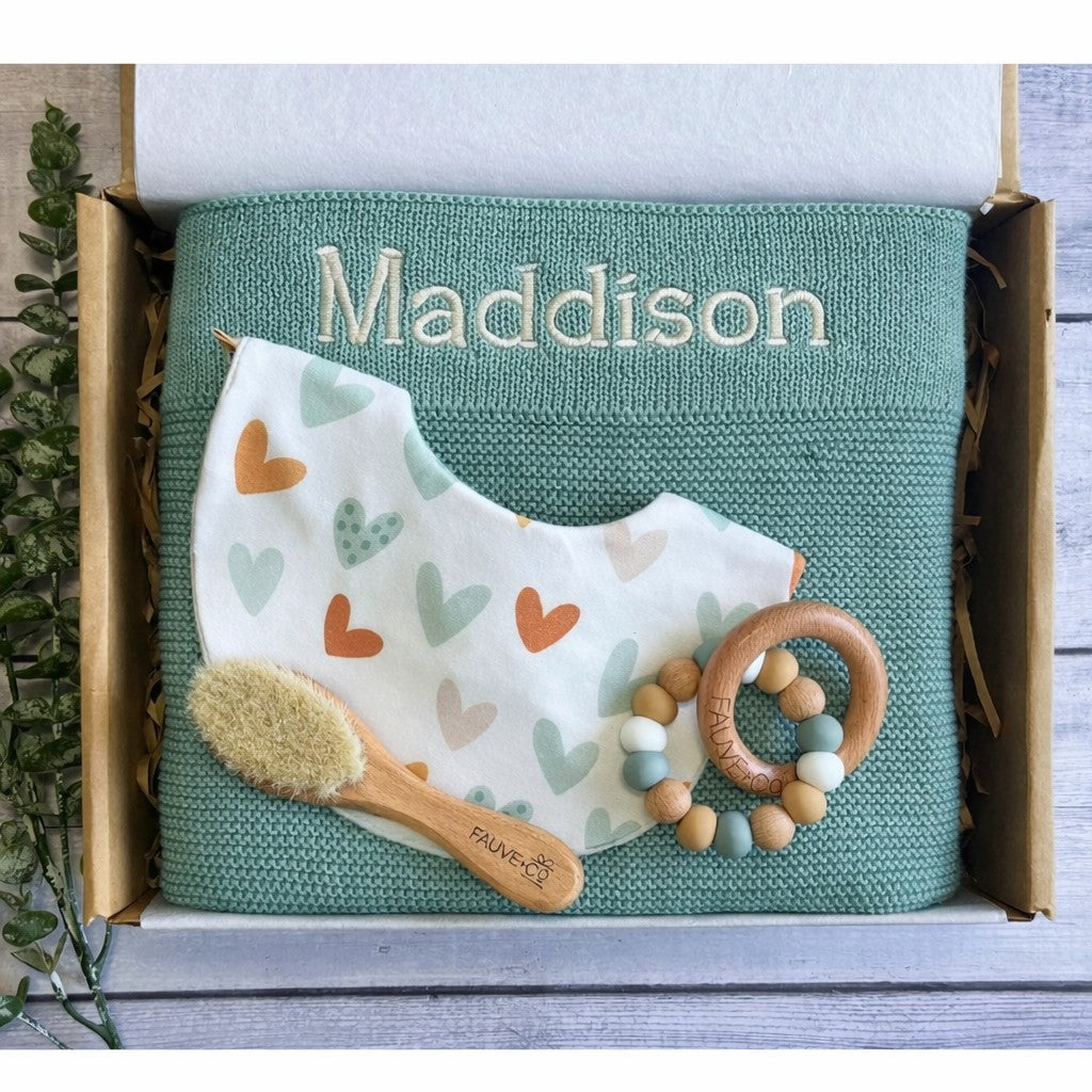Inside the Cove Gift Box, you'll find a selection of personalised and coordinated baby items in soothing, neutral tones, making it a cherished gift for baby showers, births, or just because.