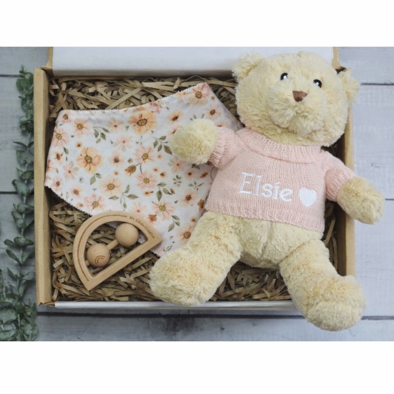 A plush companion to cherish from day one, this cuddly toy wears a custom knitted jumper embroidered with the baby’s name — a keepsake that’s as unique as they are.