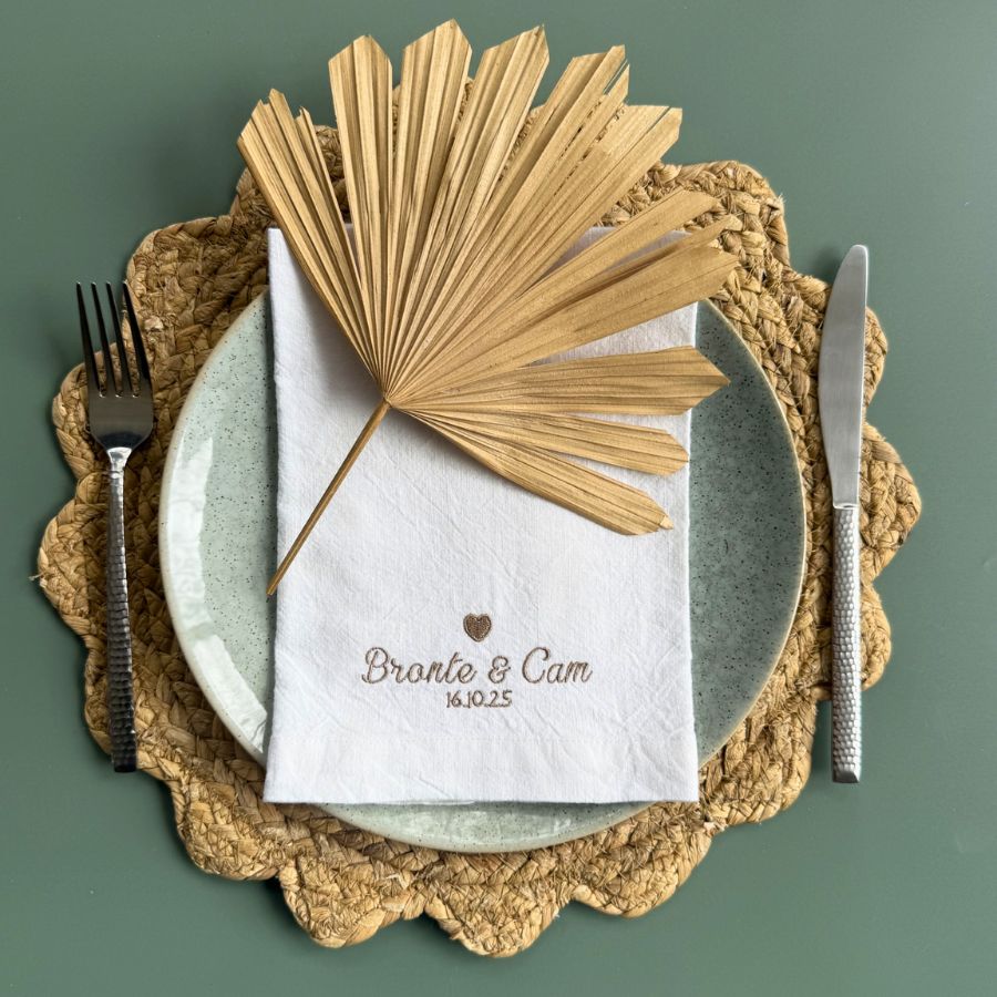 Celebrate life’s most meaningful moments with our Heirloom Love Script Napkin Set, a beautifully personalised 4-piece collection crafted from a luxurious cotton–linen blend in timeless white. Each napkin is embroidered with the couple’s name, a delicate love heart, and a special date—whether it’s the day they got engaged or the moment they said “I do.”