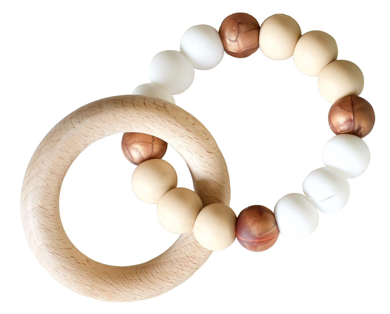 A beautifully designed teether made from baby-safe silicone and natural beechwood, perfect for soothing sore gums in style.