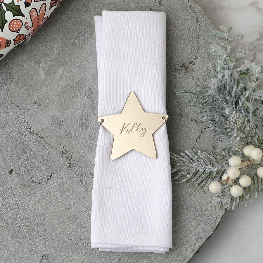 Make your Christmas dinner truly special with our Personalised Christmas Gold Star Napkin Tie. Crafted from exquisite gold acrylic, each star is carefully engraved with the name of your guest, adding a touch of elegance and personalization to your table setting. These stunning napkin ties will not only impress your guests but also create a memorable dining experience that will be cherished for years to come. Elevate your holiday festivities with a touch of sparkle and sophistication.