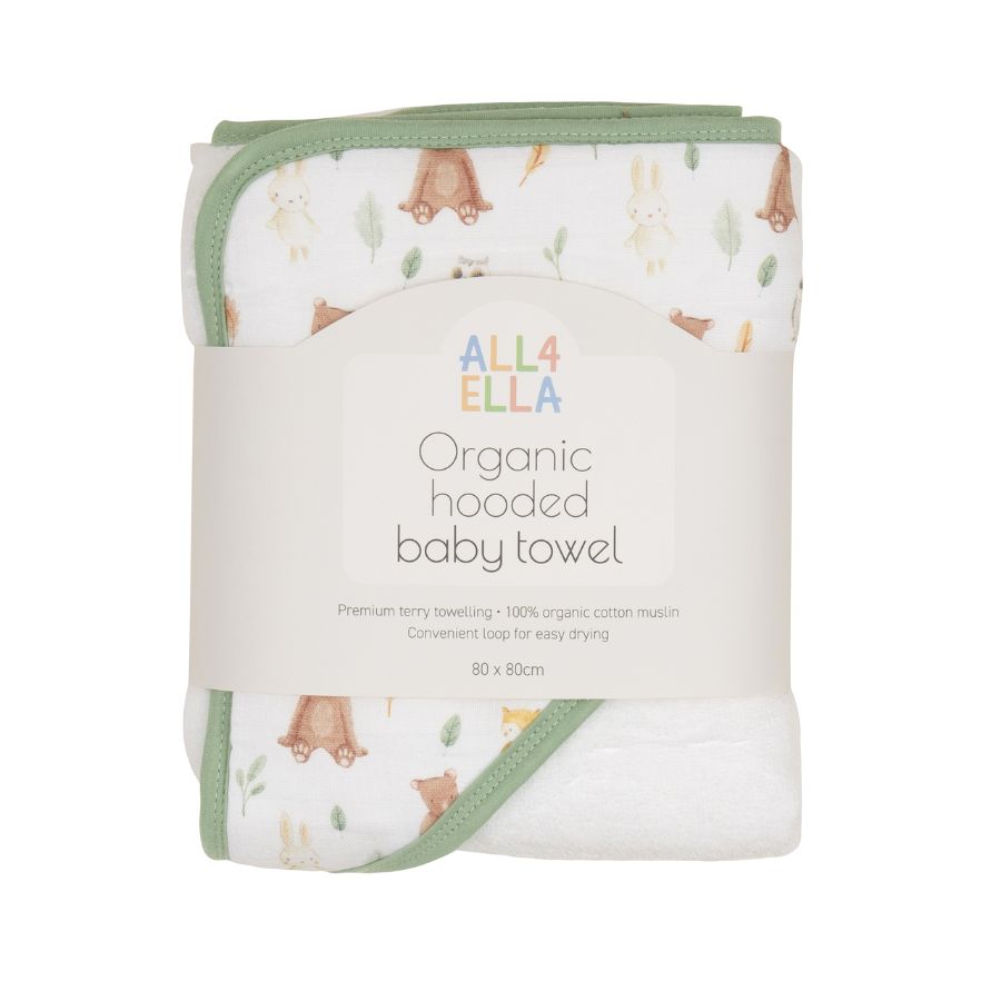 • All4Ella Forest Friends Baby Hooded Towel – Crafted from soft, absorbent fabric, this adorable hooded towel featuring a whimsical forest friends design makes bath time extra special.