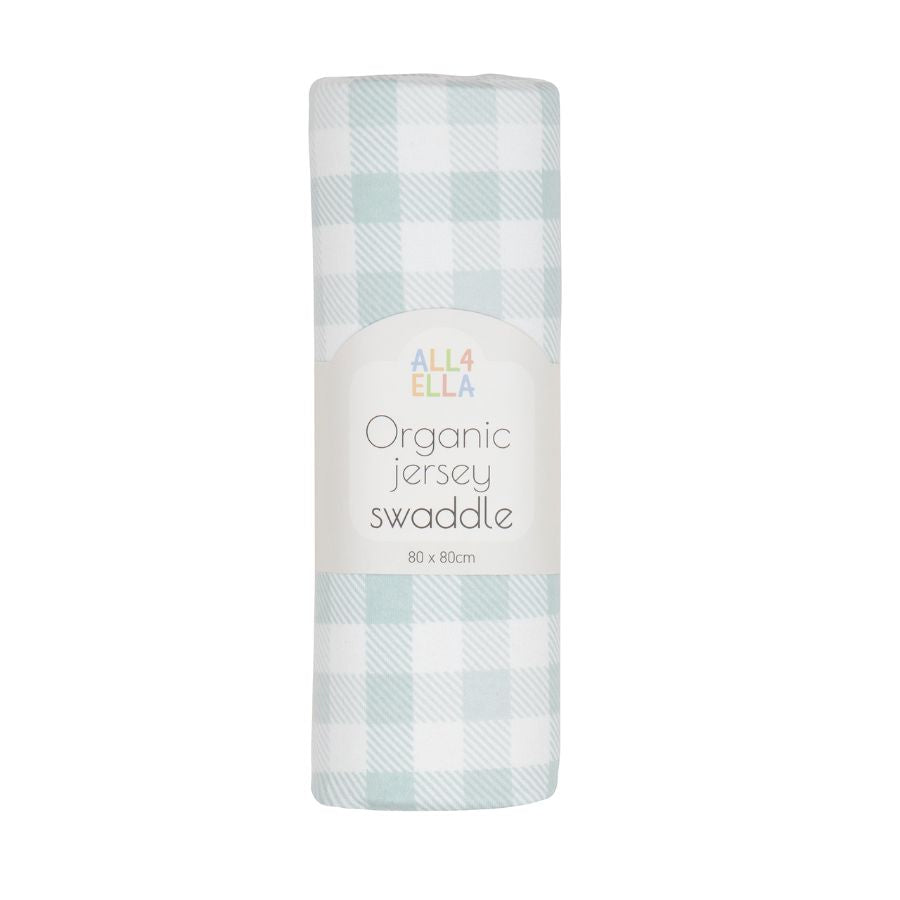 • All4Ella Sage Gingham Jersey Swaddle – Light, breathable, and super soft, this swaddle in a fresh sage gingham print is perfect for wrapping, nursing, or as a stroller cover.