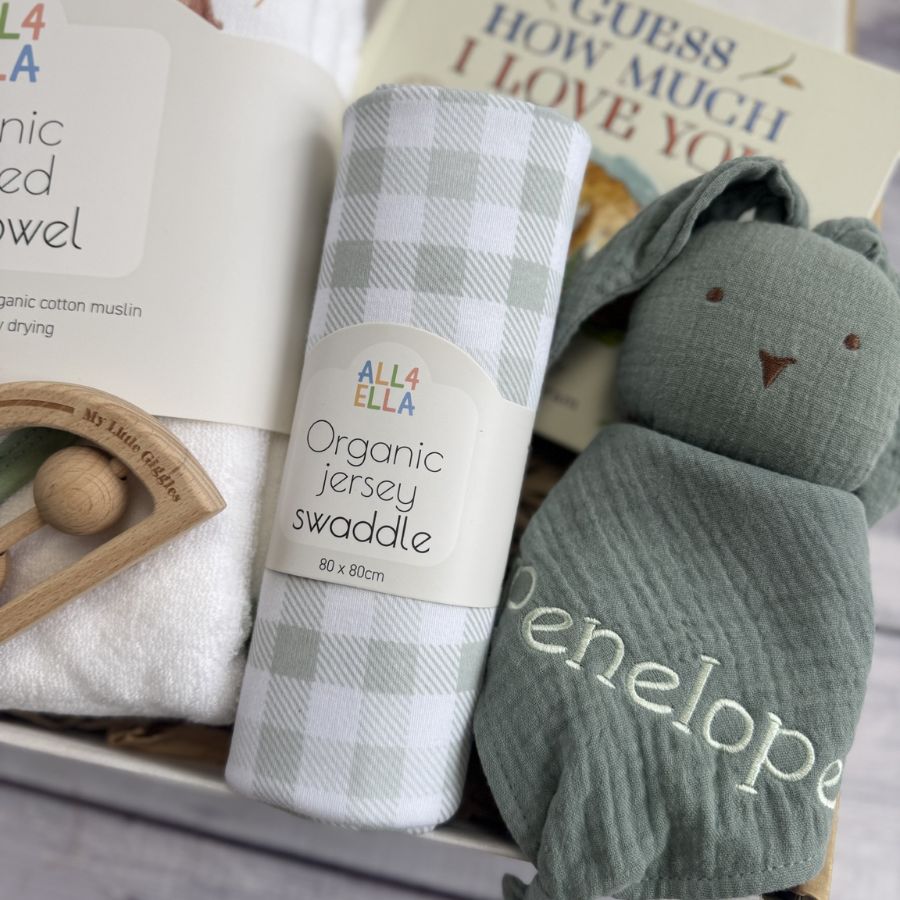 • Personalised Muslin Bunny in Fern – This cuddly muslin bunny, embroidered with baby’s name, is a keepsake treasure that will be cherished for years.